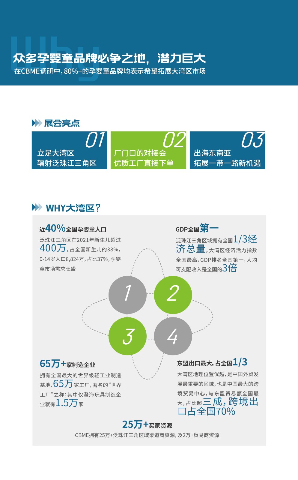 时间:2023.12.7-9主办单位: 亿百媒会展(上海)有限公司展馆:深圳会展中心(福田)展馆地址:广东省深圳市福田区福田街道福安社区福华三路与金田路交叉口4.5万+平米规模600+优质展商2万+区域专业买家定展联系:许多 132 6834 8040 CBME大湾区孕婴童展介绍展会亮点01、立足大湾区,辐射泛珠江三角区02、厂门口的对接...