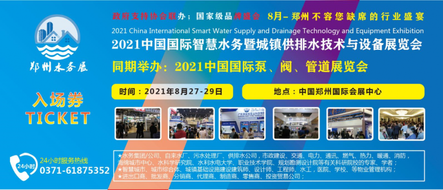 重磅消息!2021第六届郑州城镇智慧水务展览会8月开幕 2021第六届郑州智慧水务展/郑州水务大会/郑州供排水技术设备展/郑州泵阀展/郑州水展 时间:2021年8月27-29日 地点:中国·郑州国际展览中心 组织单位:纳威集团展览服务有限公司 ...