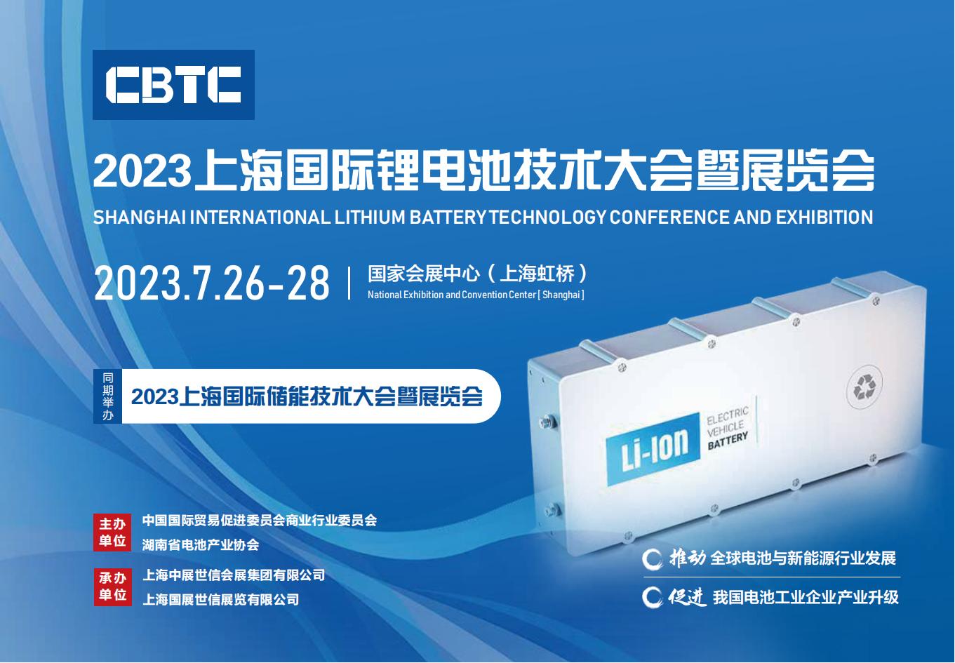 CBTC-2023上海国际锂电池展览会 时间:2023年7月26-28日 地点:国家会展中心(虹桥) 简介: CBTC-2023上海国际锂电池技术大会暨展览会由中国国际贸易促进委员会商业行业委员会、湖南省电池产业协会主办,将于2023年7月26-28日在国家会展中心(上海)举行。汇聚各类型锂离子电池、锂电池材料、锂电池生产设备、锂电池环...