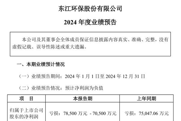 2025年01月23日,东江环保股份有限公司发布《2024年度业绩预告》。图源:东江环保公告 预告显示,东江环保预计2024年亏损78,500万元 - 70,500万元。 在业绩变动原因说明中,东江环保表示,2024 年,危废行业仍然面临激烈竞争,无害化废物收运价格继续下降、资源化废物收运折率仍在上涨,加上新投产项目转固带来的大额...