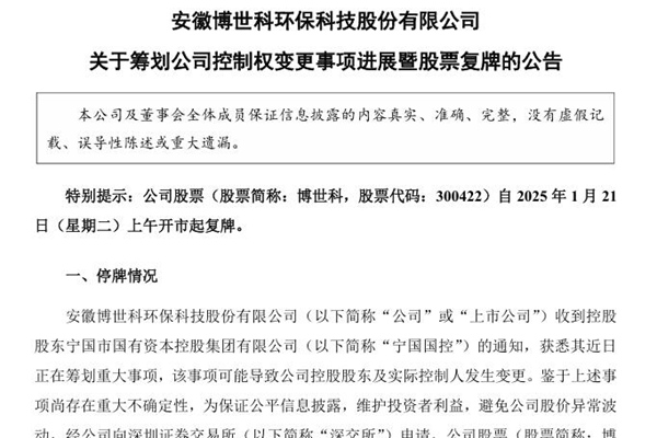 2025年01月21日, 安徽博世科环保科技股份有限公司发布《 关于筹划公司控制权变更事项进展暨股票复牌的公告》。图源:博世科公告 公告表示,2025 年1月20日,博世科的控股股东宁国国控、公司创始团队王双飞、宋海农、杨崎峰三人与南宁化工集团有限公司共同签署《表决权委托协议》,约定宁国国控、王双飞、宋海农、杨崎峰将其合计持有的公司...
