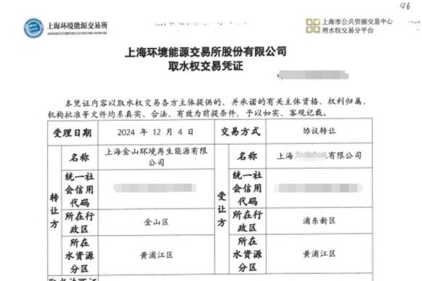 12月13日,在市水务局、市环境能源交易所支持协调下,在金山区、浦东新区水务局协作配合下,上海环境集团下属金山能源公司在上海市环境能源交易所,以协议转让方式,与浦东新区某建设项目交易了金山能源公司2025年取水权5000方。本次交易实现了水资源社会价值与经济价值的有效转化,这也是上海市首批跨行政区域的取水权交易之一,为上海市不同行政区...
