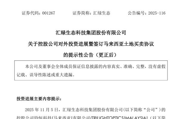 汇绿生态科技集团股份有限公司(简称:汇绿生态)公告称,11月5日,公司的控股公司钧恒科技(马来西亚)有限公司(TRILIGHTOPTICS(MALAYSIA)(下称“马来钧恒”)与BLUEMETAL INDUSTRIES SDN.BHD.签订了《买卖协议》。就马来西亚的一处地产达成土地买卖协议,马来钧恒以自有资...