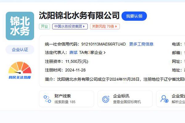 爱企查显示,11月28日,沈阳锦北水务有限公司正式成立,法定代表人为唐斌,注册资本1.15亿人民币,经营范围: 【许可项目】建设工程施工;天然水收集与分配;自来水生产与供应。(依法须经批准的项目,经相关部门批准后方可开展经营活动,具体经营项目以相关部门批准文件或许可证件为准) 【一般项目】直饮水设备销售;非常规水源利用技术研发;水...