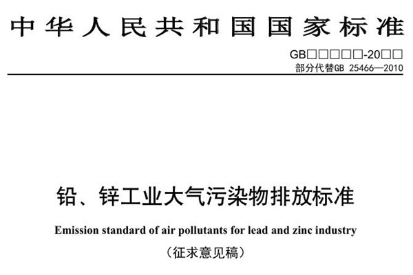 关于公开征求国家生态环境标准《铅、锌工业大气污染物排放标准》(征求意见稿)意见的通知 为贯彻《中华人民共和国环境保护法》和《中华人民共和国大气污染防治法》,完善国家大气污染物排放标准体系,促进环境空气质量改善,我部组织对《铅、锌工业污染物排放标准》(GB 25466—2010)大气部分进行了修订,编制了国家生态环境标准《铅、...