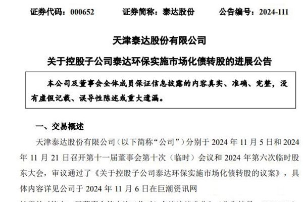 12月3日,A股上市垃圾焚烧企业天津泰达股份有限公司(简称:泰达股份)公告称,日前,公司及控股子公司天津泰达环保有限公司、中国中信金融资产管理股份有限公司、中国银河资产管理有限责任公司已完成相关协议的签署工作。泰达环保完成了工商登记变更,并取得新的《营业执照》。 本次市场化债转股完成后,泰达环保的注册资本由 135,537.7566...