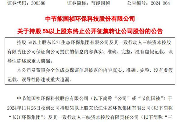 中节能国祯环保科技股份有限公司(简称:节能国祯)近日发布《关于持股 5%以上股东终止公开征集转让公司股份的公告》。该公告显示,节能国祯持股5%以上股东长江生态环保集团有限公司(以下简称“长江环保集团”)及其一致行动人三峡资本控股有限责任公司(以下简称“三峡资本”)决定,终止公开征集转让程...