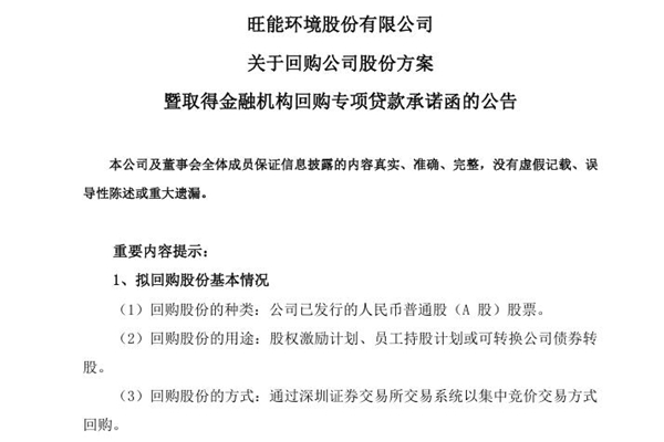 2024年11月28日,旺能环境股份有限公司发布《关于回购公司股份方案暨取得金融机构回购专项贷款承诺函的公告》。图源:旺能环境公告 公告显示,本次回购的总金额不低于10,000万元人民币,不超过20,000万元人民币,具体回购资金总额以回购期满时实际回购股份使用的资金总额为准。 本次回购股份的价格不超过人民币22.00元/股,该回...
