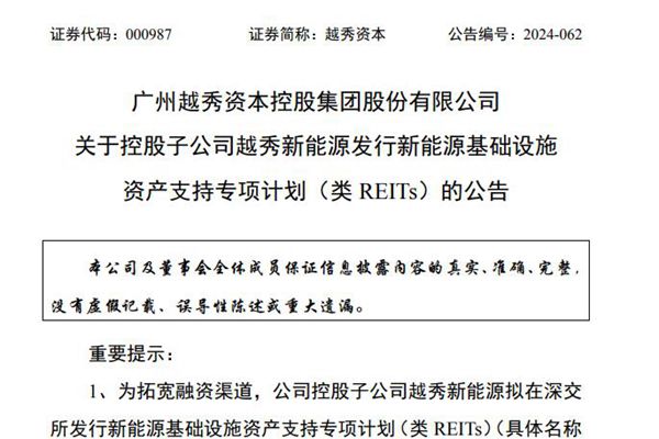 11月22日,广州越秀资本控股集团股份有限公司(简称:越秀资本)发布公告,宣布其控股子公司越秀新能源计划发行新能源基础设施资产支持专项计划(类REITs),发行规模不超过7.2亿元,旨在拓宽融资渠道。该计划涉及的项目公司为浙江泰彦新能源有限公司,越秀新能源持有其100%股权。 此次发行方案中,原始权益人为广州越秀新能源投资有限公司,...