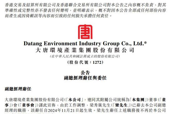 大唐环境产业集团股份有限公司(简称:大唐环境)近日发布公司副总经理辞任与委任公告,副总经理梁秀广因工作调整辞职,辞任自2024年11月21日起生效,辞任后不再担任本公司及其附属公司的任何职务。梁秀广确认与董事会无意见分歧,且与其辞任相关的其他事项无需通知香港联合交易所有限公司及本公司股东。 同时,董事会宣布任海涛为新任副总经理,自2...