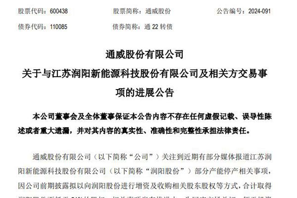 通威股份有限公司(简称:通威股份)近日披露《关于与江苏润阳新能源科技股份有限公司(下称“润阳新能源”)及相关方交易事项的进展公告》。公告中提到,截至目前,相关工作尚在进行中,交易各方仍在持续就交易相关事项进行磋商,不排除原交易方案可能存在调整或终止的风险;磋商过程中,交易各方也同步在积极探讨其他整合方案,如有确...