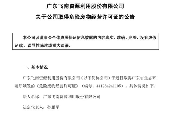 2024年11月7日,广东飞南资源利用股份有限公司发布《关于公司取得危险废物经营许可证的公告》。图源:飞南资源公告 公告称,飞南资源于近日取得广东省生态环境厅颁发的《危险废物经营许可证》 编号:441284241105)。 法人名称:广东飞南资源利用股份有限公司 法定代表人:孙雁军 住所:四会市罗源镇罗源工业园 经营设施地址...