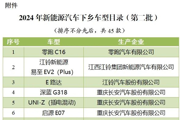 关于发布2024年新能源汽车下乡车型目录(第二批)的通知工信厅联通装函〔2024〕412号 各省、自治区、直辖市及计划单列市工业和信息化主管部门、发展改革委、农业农村(农牧)厅(局、委)、商务主管部门、能源主管部门: 为贯彻落实党中央、国务院决策部署,加快补齐农村地区新能源汽车消费使用短板,赋能美丽乡村建设和乡村振兴,按照推动大规模设...