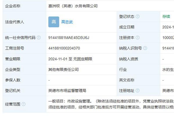 天眼查数据显示,近日,葛洲坝(英德)水务有限公司成立,法定代表人为高忠武,注册资本1亿人民币,经营范围为市政设施管理,自来水生产与供应,天然水收集与分配,建设工程施工。图源:天眼查 股东信息显示,该公司由宁波水清景美股权投资合伙企业(有限合伙)、英德市国有资产经营管理有限责任公司、中国葛洲坝集团股份有限公司等共同持股。...