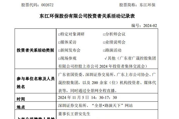 东江环保股份有限公司(简称:东江环保)已于 2024 年 11 月 5 日在深圳证券交易所参加广东省广晟控股集团有限公司控股上市公司 2024 年投资者集体交流会,主要交流内容如下: 1、感谢董事长的分享,希望进一步了解公司下一步的发展战略? 答:公司下一步的定位为中国资源循环产业领军企业及优秀的综合环境服务商。 总体思路:紧贴...