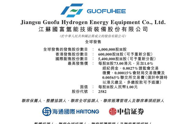 2024年11月7日,江苏国富氢能技术装备股份有限公司发布《全球发售》公告。图源:江苏国富氢能技术装备股份有限公司 国富氢能拟全球发售600万股H股,中国香港发售股份60万股,国际发售股份540万股,发售价将为每股发售股份65.00-73.00港元,预期股份将于2024年11月15日开始在联交所买卖。 国富氢能表示,公司是氢能储运...