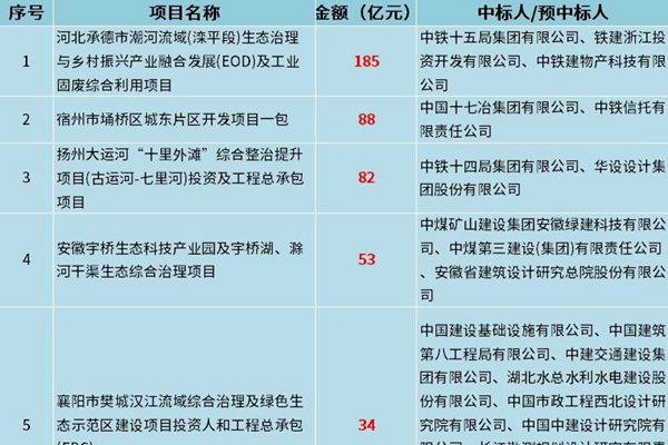 进入2024年以来,中铁、中建、中交等“中字头”在环保项目市场出现得愈发频繁,不仅稳坐百十亿级EOD、EPC拿标“第一把交椅”,参与亿元以下中小体量项目争夺的热情也日渐高涨。这些自带资源、体量,品牌优势的“巨无霸”,通过彼此联合及牵手地方国资、民营企业等,正在环保...