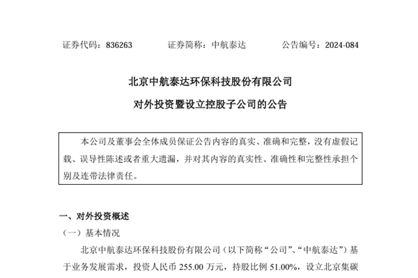 2024年10月22日北京中航泰达环保科技股份有限公司发布《对外投资暨设立控股子公司的公告》,拟投资人民币255.00万元,持股比例51.00%,设立北京集碳科技有限公司。 投资标的基本情况: 名称:北京集碳科技有限公司 注册地址:北京市东城区青龙胡同甲1号、3号2幢3层306-05室 经营范围:一般项目:技术服务、技术开发、...