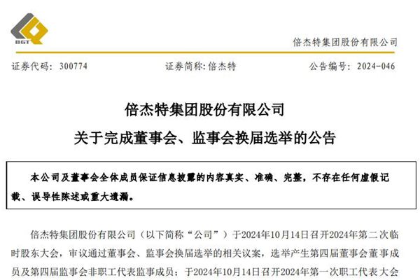 倍杰特集团股份有限公司(简称:倍杰特)近日发布《关于完成董事会、监事会换届选举的公告》,其第四届董事会由9名董事组成,其中非独立董事6名,独立董事3名,任期自公司2024年第二次临时股东大会选举通过之日起三年。 第四届董事会成员情况 1、非独立董事:权秋红女士、张建飞先生、权思影女士、张磊先生、郭以果女士、王志稳先生 2、独立董...