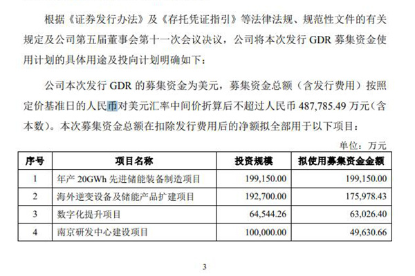 2024年10月14日,阳光电源股份有限公司发布系列通告,拟境外发行全球存托凭证(Global DepositaryReceipts)新增境内基础股份。图源:阳光电源公告 公告明确,本次发行 GDR 的募集资金为美元,募集资金总额(含发行费用)按照定价基准日的人民币对美元汇率中间价折算后不超过人民币 487,785.49 万元(含本...