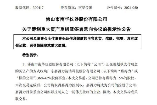 佛山市南华仪器股份有限公司(简称:南华仪器)10月11日发布《关于筹划重大资产重组暨签署意向协议的提示性公告》,表示公司正在筹划以支付现金购买资产的方式收购广东嘉得力清洁科技股份有限公司(下称“嘉得力”)36%-45%股份事宜。 本次交易前,南华仪器已持有嘉得力 15%的股权。本次交易完成后,南华仪器将取得嘉...