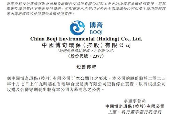 港股上市环境企业中国博奇环保(控股)有限公司(简称:博奇环保)发布公告称,公司股份将于2024年10月7日上午9时起在香港联合交易所有限公司短暂停止买卖,以待根据公司收购及合并守则发出载有公司内幕消息的公告。 公开资料显示,博奇环保是向工业企业及城市提供环境治理及双碳新能源+综合服务的绿色生态治理企业。业务主要聚焦在烟气治理、水处理...