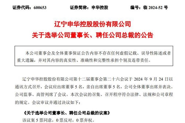 9月25日,A股国企上市企业辽宁申华控股股份有限公司(简称:申华控股)发布公告称,其董事长及总裁李景伟因工作变动,向公司董事会递交了辞职信,辞去其担任的第十二届董事会董事、董事长、董事会专业委员会职务及公司总裁职位,辞职后将不再担任公司任何职务。 同一日,申华控股还宣布,公司已召开第十二届董事会第二十六次会议,会上通过了选举高新刚为...