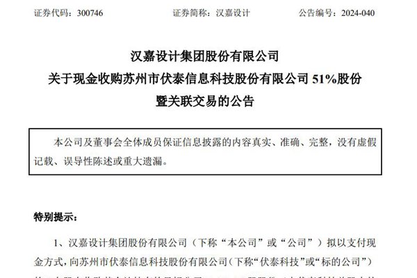 9月11日,A股上市企业汉嘉设计集团股份有限公司(简称:汉嘉设计)发布《关于现金收购苏州市伏泰信息科技股份有限公司(下称:伏泰科技)51%股份暨关联交易的公告》,拟向伏泰科技的62名股东收购其持有的21,445,459股股份(占伏泰科技总股本的51%),合计对价人民币约5.81亿元。图源:汉嘉设计公告 汉嘉设计表示,本次交易构成关联...