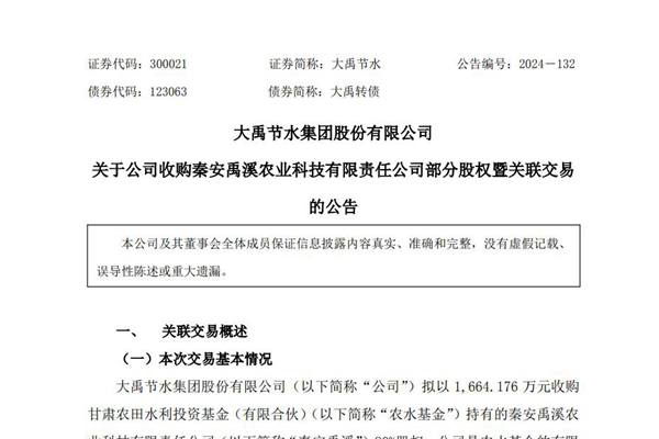 大禹节水集团股份有限公司(简称:大禹节水)9月13日公告称,公司拟收购秦安禹溪农业科技有限责任公司(下称“秦安禹溪”)80%股权,原由甘肃农田水利投资基金(有限合伙)(下称“农水基金”)持有,交易价格1,664.176万元。 因大禹节水是农水基金的有限合伙人(认缴出资占比40%),且同...