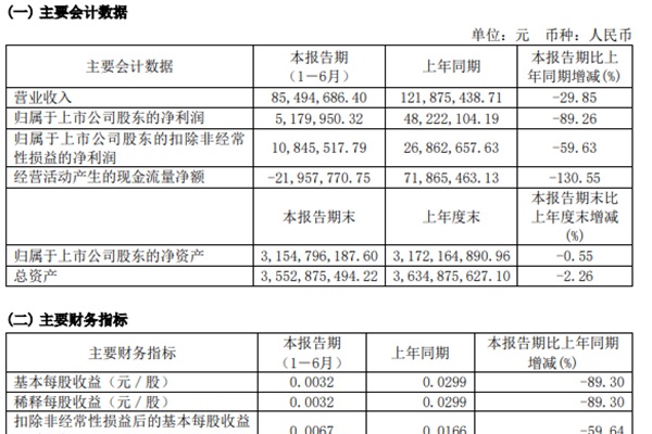 黑龙江国中水务股份有限公司(下称“国中水务”)8月31日发布半年度业绩报告称,2024年上半年营业收入约8549万元,同比减少29.85%;归属于上市公司股东的净利润约518万元,同比减少89.26%;基本每股收益0.0032元,同比减少89.3%。 基本每股收益0.0032元。截至本报告期末,公司总资产35...