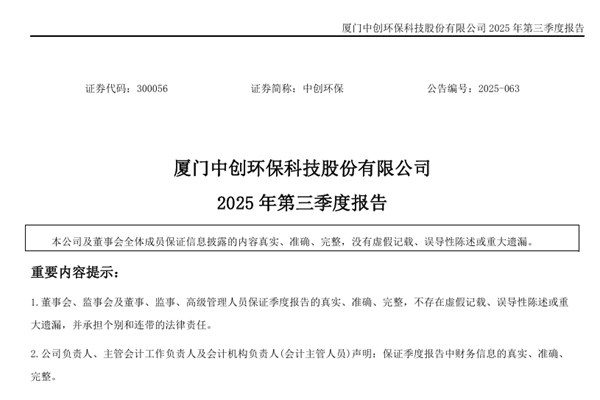 厦门中创环保科技股份有限公司(简称:中创环保)近日发布《2025年第三季度报告》。2025年前三季度,中创环保实现营业总收入2.58亿元,同比下降3.96%;归母净利润亏损4673.65万元,上年同期亏损1097.51万元;扣非净利润亏损5061.15万元,上年同期亏损4375.03万元;经营活动产生的现金流量净额为-4217.87万...