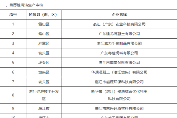 湛江市工业和信息化局 湛江市生态环境局关于公布2024年应实施清洁生产审核企业名单的通知 各县(市、区)工业和信息化部门、市生态环境局各县(市、区)分局: 为贯彻落实《中华人民共和国清洁生产促进法》,全面推动我市重点企业清洁生产审核工作,根据《广东省工业和信息化厅 广东省生态环境厅关于开展2024年度工业领域清洁生产工作的通知》(粤工...