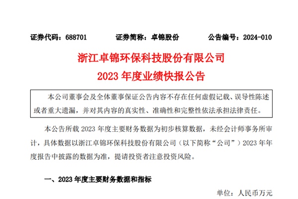 2024年2月28日,浙江卓锦环保科技股份有限公司发布《2023年度业绩快报公告》(全文见附件),数据显示。公司2023年度营业总收入预计为3.48亿元,较上年同期增长41.72%;营业利润-1.23亿元,较去年同期下降27.95%。此外,归属于母公司所有者的净利润-1.19 亿元、 归属于母公司所有者的扣除非经常性损益的净利润-1....