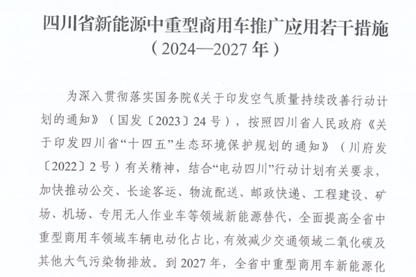 为加快推动全省中重型商用车新能源化,提高机动车清洁化水平,有效减少交通领域二氧化碳及其他大气污染物排放,结合四川省实际,四川省经信厅等4部门联合制发《四川省新能源中重型商用车推广应用若干措施(2024-2027年)》,并于近日印发。 该文件力要求加快推动公交、长途客运、物流配送、邮政快递、工程建设、矿场、机场、专用无人作业车等领域新...