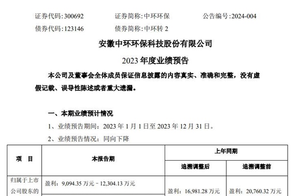 安徽中环环保科技股份有限公司(简称:中环环保)发布《2023年度业绩预告》,预计2023年实现归属于上市公司股东的净利润盈利9,094.35万元–12,304.13万元,比上年同期(追溯调整后)下降28%–46%;扣除非经常性损益后的净利润盈利6,949.87万元–10,159.64 万元,比上年同...