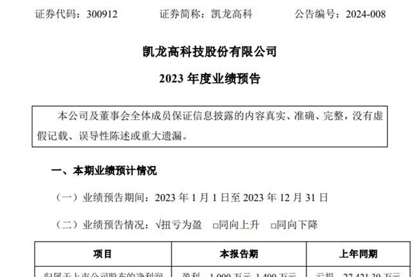 凯龙高科技股份有限公司(简称:凯龙高科)近日发布《2023年度业绩预告》,预计2023年实现归属于上市公司股东的净利润盈利1000万元–1400万元,上年同期亏损27,421.39万元,成功扭亏为盈;扣除非经常性损益后的净利润亏损450万元–800万元,上年同期亏损29662.63万元。 报告期内,凯龙高科成...