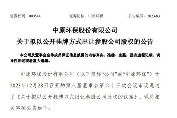 中原环保股份有限公司(简称:中原环保)公布,根据公司战略布局,公司拟将持有的中原环保郑州污泥新材料科技有限公司(简称“污泥新材料”)35%股权在产权交易机构以公开挂牌的方式进行转让,转让完成后,中原环保不再持有污泥新材料公司股权,公司合并报表范围无变化。本次拟公开转让的35%股权对应评估值为149.42万元。 ...