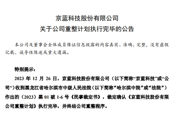 2023年12月27日,京蓝科技股份有限公司发布《关于公司重整计划执行完毕的公告》,公告显示, 2023 年 12 月 26 日,公司收到黑龙江省哈尔滨市中级人民法院作出的(2023)黑 01 破 1-6 号《民事裁定书》,裁定确认《京蓝科技股份有限公司重整计划》执行完毕,并终结公司重整程序。 京蓝科技表示,通过重整程序将化解目前的...