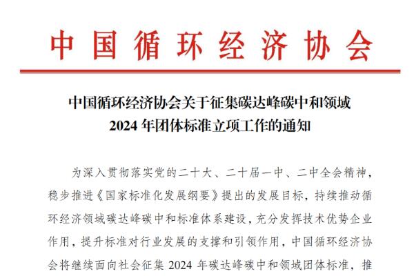 中国循环经济协会关于征集碳达峰碳中和领域2024年团体标准立项工作的通知 为深入贯彻落实党的二十大、二十届一中、二中全会精神,稳步推进《国家标准化发展纲要》提出的发展目标,持续推动循环经济领域碳达峰碳中和标准体系建设,充分发挥技术优势企业作用,提升标准对行业发展的支撑和引领作用,中国循环经济协会将继续面向社会征集2024年碳达峰碳中和领...