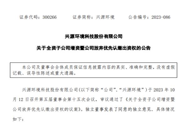10月14日,兴源环境科技股份有限公司(简称:兴源环境)《关于全资子公司增资暨公司放弃优先认缴出资权的公告》发布。公告显示,兴源环境子全资子公司杭州兴源环保设备有限公司(下称“兴源环保”)拟通过增资扩股形式引入宁波奉化兴奉国新投资管理有限公司(下称“兴奉国新”)。 兴奉国新拟以现金方式...