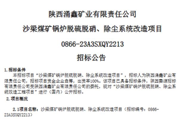 中国招标投标公共服务平台发布沙梁煤矿锅炉脱硫脱硝、除尘系统改造项目招标公告,为了节约能耗且达标排放,需对锅炉SCR脱硝、SNCR脱硝、除尘系统进行改造,改造后保证锅炉在高负荷、低负荷运行状态下,排放指标均能达标。 原标题:沙梁煤矿锅炉脱硫脱硝、除尘系统改造项目招标...