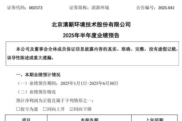 北京清新环境技术股份有限公司(简称:清新环境)近日发布《2025年半年度业绩预告》。报告期内,清新环境预计实现归属于上市公司股东的净利润盈利1,200.00万元–1,600.00万元,上年同期盈利7,145.63万元,同比下降77.61%-83.21%;扣除非经常性损益后的净利润盈利100.00万元–500.0...
