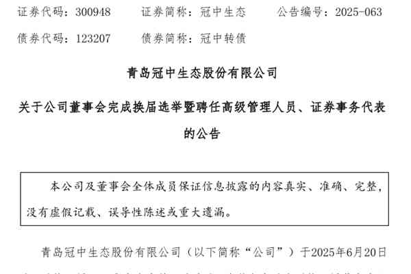 青岛冠中生态股份有限公司(简称:冠中生态)近日公告称,公司7月11日召开了第五届董事会第一次会议,审议通过了一系列议案,设立了第五届董事会各专门委员会及其人员组成、完成了高级管理人员和证券事务代表的换届聘任。详情如下↓ (一)第五届董事会成员 1、董事长:李春林先生 2、非独立董事:李春林先生、许剑平女士、高军先生、张...