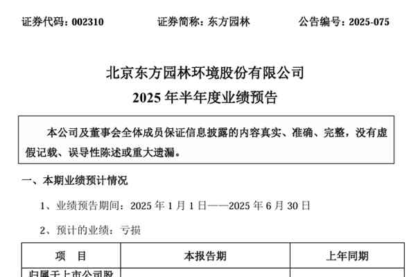 北京东方园林环境股份有限公司(简称:东方园林)近日发布《2025年半年度业绩预告》。报告期内,东方园林预计实现归属于上市公司股东的净利润亏损100万元–200万元,上年同期亏损113,864.89 万元;扣除非经常性损益后的净利润亏损400万元–800万元,上年同期亏损113,750.49 万元;基本每股收益亏...