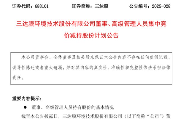 三达膜环境技术股份有限公司(简称:三达膜)近日公告称,因自身资金需求,公司董事、总经理方富林先生和公司财务总监唐佳菁女士拟自本减持股份计划公告披露之日起15个交易日后的3个月内通过集中竞价方式进行减持其持有的公司股份,分别不超过281,362股、133,762股。 上述股份减持价格按减持实施时的市场价格确定。在减持计划实施期间,公司...