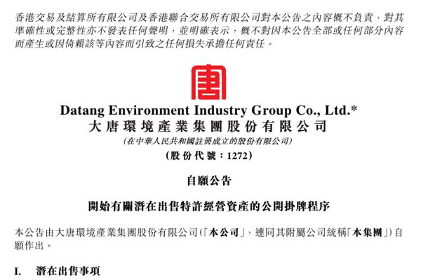 4月28日,港股上市公司大唐环境公告称,大唐环境产业集团股份有限公司平罗项目分公司(公司分公司,"大唐环境平罗分公司")拟出售有关国能平罗发电有限公司("平罗电厂")与大唐环境平罗分公司订立脱硫脱硝特许经营协议的特许经营项目项下的所有资产。 监于根据中华人民共和国有关法律及法规,出售资产被视为国有资产,潜在出售事项将根据中国有关监管...