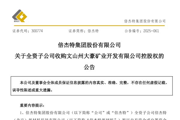 11月19日晚间,上市水处理企业倍杰特集团股份有限公司(简称:倍杰特)公告称,全资子公司倍杰特(北京)新材料科技有限公司(下称“倍杰特新材料”)拟以自有资金或自筹资金22,480.00万元收购汤玮、龙岩市小娘坑矿业有限公司(简称“小娘坑矿业”)、王育才合计持有的文山州大豪矿业开发有限公司...
