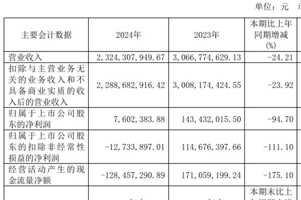 中材节能股份有限公司(简称:中材节能)4月1日正式发布《2024年年度报告》。报告期内,中材节能实现营业收入为23.24亿元,同比减少24.21%。归属于上市公司股东的净利润为760.24万元,同比减少94.70%。归属于上市公司股东的扣除非经常性损益的净亏损为1273.39万元。基本每股收益为0.0125元。此外,拟向全体股东每10...