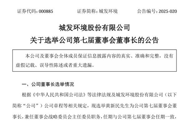 城发环境股份有限公司(简称:城发环境)3月29日公告称,公司已选举黄新民先生为公司第七届董事会董事长,兼任董事会战略委员会主任委员职务,任期与公司第七届董事会任期一致,可连选连任。根据公司章程规定,董事长为公司法定代表人,公司法定代表人相应由白洋先生变更为黄新民先生,并授权公司经营管理层办理工商变更登记等相关事宜。图源:城发环境公告 ...