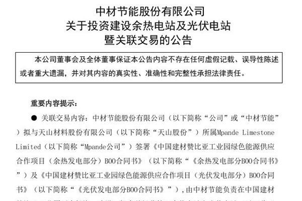 2025年03月27日,中材节能股份有限公司发布《关于投资建设余热电站及光伏电站暨关联交易的公告》。图源:中材节能公告 中材节能拟与天山材料股份有限公司所属Mpande Limestone Limited签署《中国建材赞比亚工业园绿色能源供应合作项目(余热发电部分)BOO合同书》及《中国建材赞比亚工业园绿色能源供应合作项目(光伏发电...